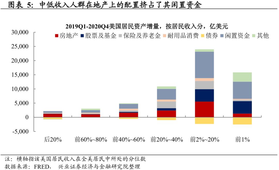 中低收入人群“闲钱”有限,因其大部分资金配置在地产。从2020年美国居民新增资产的分布来看,前10%的高收入人群会分配较多的新增资金投资在股票中,但中低收入人群基本把大部分新增资金都配置在地产中,这实际上挤占了中低收人群的闲置资金。
