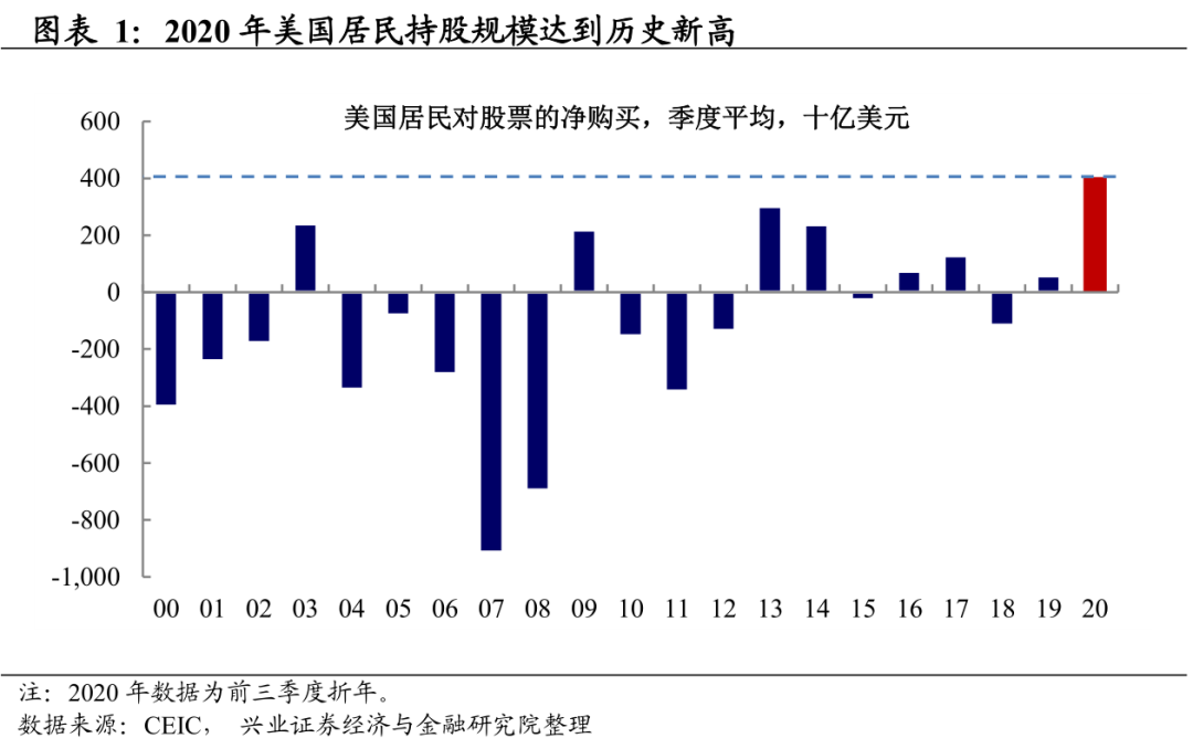 美股散户化的背后是史无前例的流动性宽松。在高度机构化的美股市场,出现散户逼空机构事件,其背后是流动性大幅宽松下的资金外溢。2020年,为应对新冠疫情,美国实行了大规模的货币及财政宽松政策,尤其是向居民直接发放现金及发放失业救助金等政策,使居民手中的闲置资金显著增加。在这一背景下,2020年美国居民平均净购买股票金额可达到4043亿美元,创下历史新高。这或许能解释为何2020年以来美股散户化的趋势愈加明显。