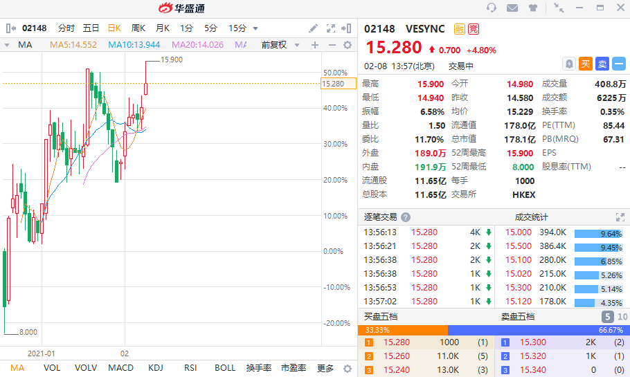 华盛资讯2月8日消息,小家电次新股VESYNC(02148)午后拉升至新高,盘中最高见15.9港元。截至发稿,VESYNC涨4.8%,报15.28港元,成交额6225万港元,当前总市值达178.1亿港元。