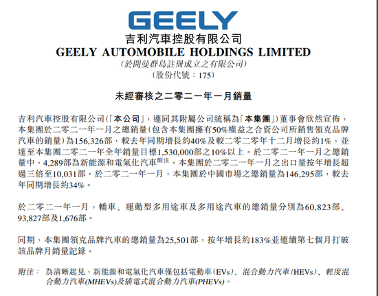 2021年1月的总销量中,4,289部为新能源和电气化汽车。集团于2021年1月的出口量按年增长超过三倍至10,031部。2021年1月,集团在中国市场的总销量为146,295部,较去年同期增长约34%。