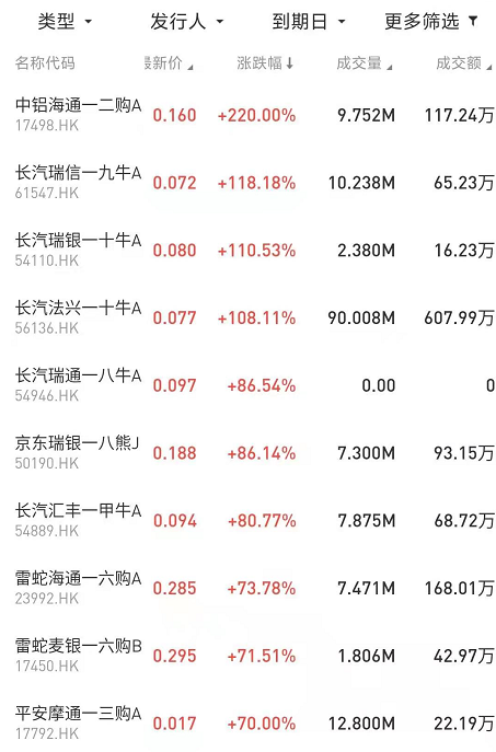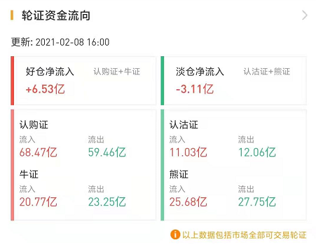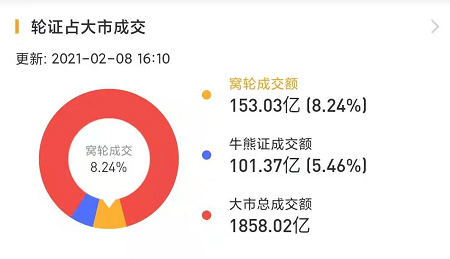 其中,窝轮总成交153.03亿港元,牛熊证总成交101.37亿港元。