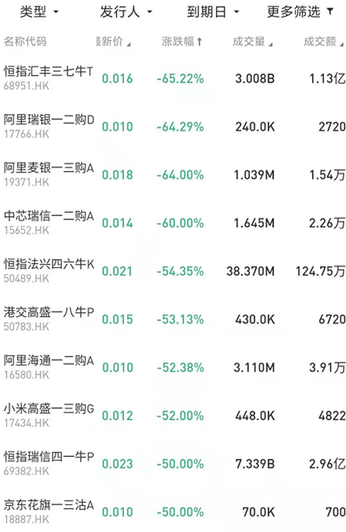 在今日跌幅榜中,恒指汇丰三七牛T(68951)大跌65.22%;阿里瑞银一二购D(17766)大跌64.29%。