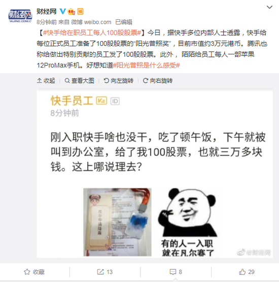 快手给在职员工每人100股股票!目前市值约3万元港币