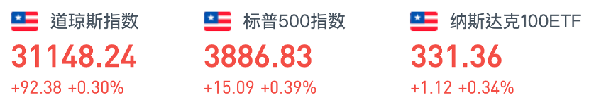 截至收盘,标普500指数涨15.1点,涨幅0.39%,报3886.83点;纳斯达克指数涨78.6点,涨幅0.57%,报13856.3点;道琼斯指数涨92.4点,涨幅0.3%,报31148.24点。
