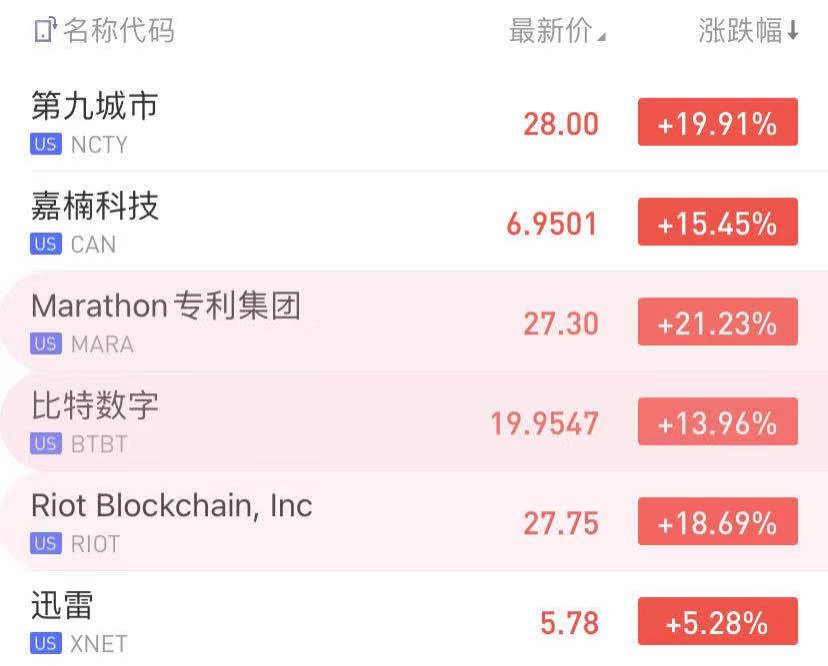 截至发稿,第九城市大涨近20%,比特币矿机生产商嘉楠科技大涨超15%,Marathon大涨超21%,比特数字大涨近14%,迅雷涨超5%。