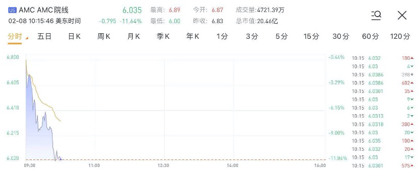 华盛资讯2月8日讯,AMC盘中跌幅扩大。截至发稿,AMC大跌11.64%,现报6.03美元,当前总市值缩水至20亿美元左右。据悉,此前万达进行了AMC股份转换,可能为出售股份。