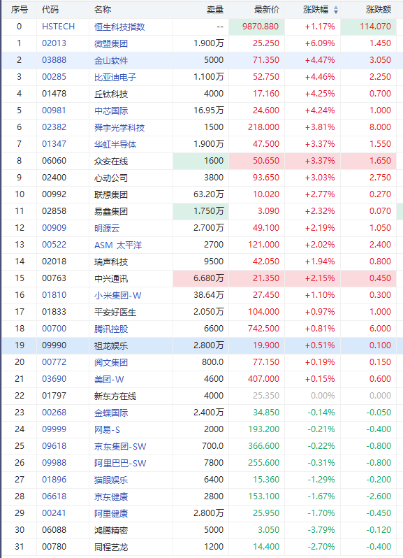 其他成分股,中芯国际涨超4%,华虹半导体涨超3%,小米涨超1%,猫眼娱乐、京东健康、阿里健康跌超1%。