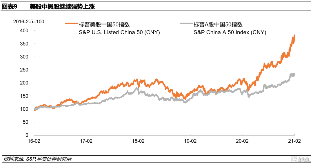 4)交易中美与国际关系“正常化”的预期。近期拜登政府在中美关系上提到“耐心”、“一个中国”、“合作”等,同时表现出积极参与国际合作、团结盟友的热情。2月3日,美国国务院表示在台湾问题上支持“一个中国”政策没有改变。2月4日,拜登上任后首次发表外交政策演讲。拜登将中国称为“最重要的竞争对手”(most serious competitor),声称将直面中国给美国带来的“挑战”,主要包括经济、知识产权、所谓的“人权”、国际关系与全球治理等方面。但亦展现了一定合作姿态,表示在符合美国利益的情况下,美国已经准备与中国合作。除中国外,拜登讲话还涉及与盟国紧密合作、俄罗斯的“侵略行动”、缅甸局势、应对气候变化、也门战争等。整体而言,拜登政府目前对华政策取向仍不是非常明确,但在“美国回来了”、“反特朗普”等思想下,未来一个整体上趋于稳定的国际形势(包括中美关系)是可以期待的。值得关注的是,随着2020年拜登当选预期加强、2021年拜登正式上台,美股中概股不断有亮眼表现,近期仍强势上涨,或一定程度上反映市场对中美关系的期待(图表9)。