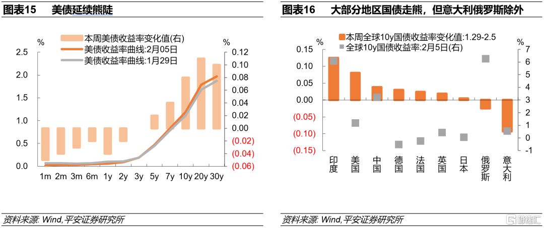 本周2年期以内美债收益率下行,5年期以上收益率上行(图表15)。美债自上周开始延续“熊陡”,但本周逻辑不同:上周是流动性担忧导致“股债双杀”,本周是risk on情绪释放使国债需求减弱。全球10年期国债中,除美债外,印度、中国等大部分地区国债收益率均走高,意大利和俄罗斯却走低,呈现“股债双牛”现象(图表16)。