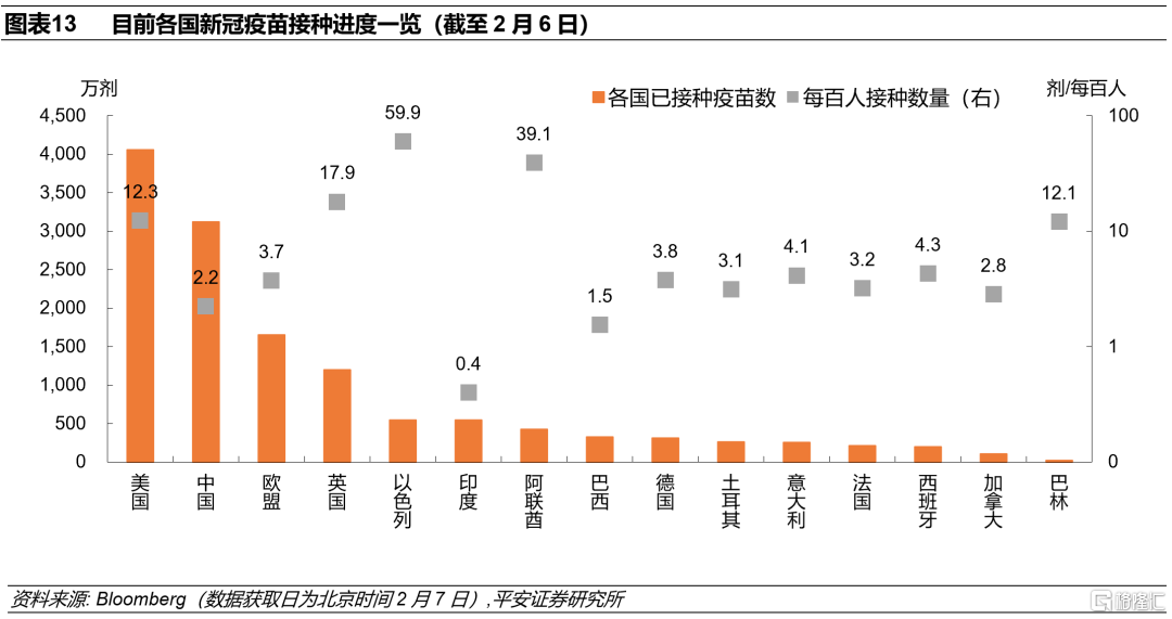 据Bloomberg统计,截至2月6日,全球已经有73个国家接种了超过1.28亿剂疫苗,全球平均每天接种469万剂。其中,美国已经注射了4050万剂疫苗,该数字已经超过美国累计确诊人数,过去一周平均每天注射143万剂。从每百人接种数看,以色列(59.9,上周51.7)、阿联酋(39.1,上周29.0)和英国(17.9,上周13.3)领先全球,美国这一数字达到12.3,欧盟仅3.7。