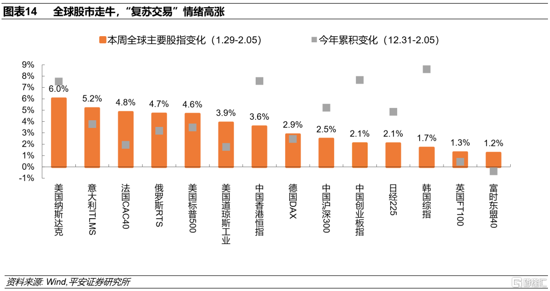 如果说美股上涨的主逻辑是“拜登交易”,那么本周全球股市上涨的主逻辑或可归结为“复苏交易”。本周美欧等陆续发布GDP、就业和PMI等经济数据,多数略好于预期,但也没有“过度”好到政策可以提前退出的程度,基本面与政策面均给予市场一定信心。此外,美国“散户逼空”之战的扰动减弱、此前中美央行“联袂演出”下的紧张情绪在本周得以舒缓等,亦助推全球risk on情绪释放。