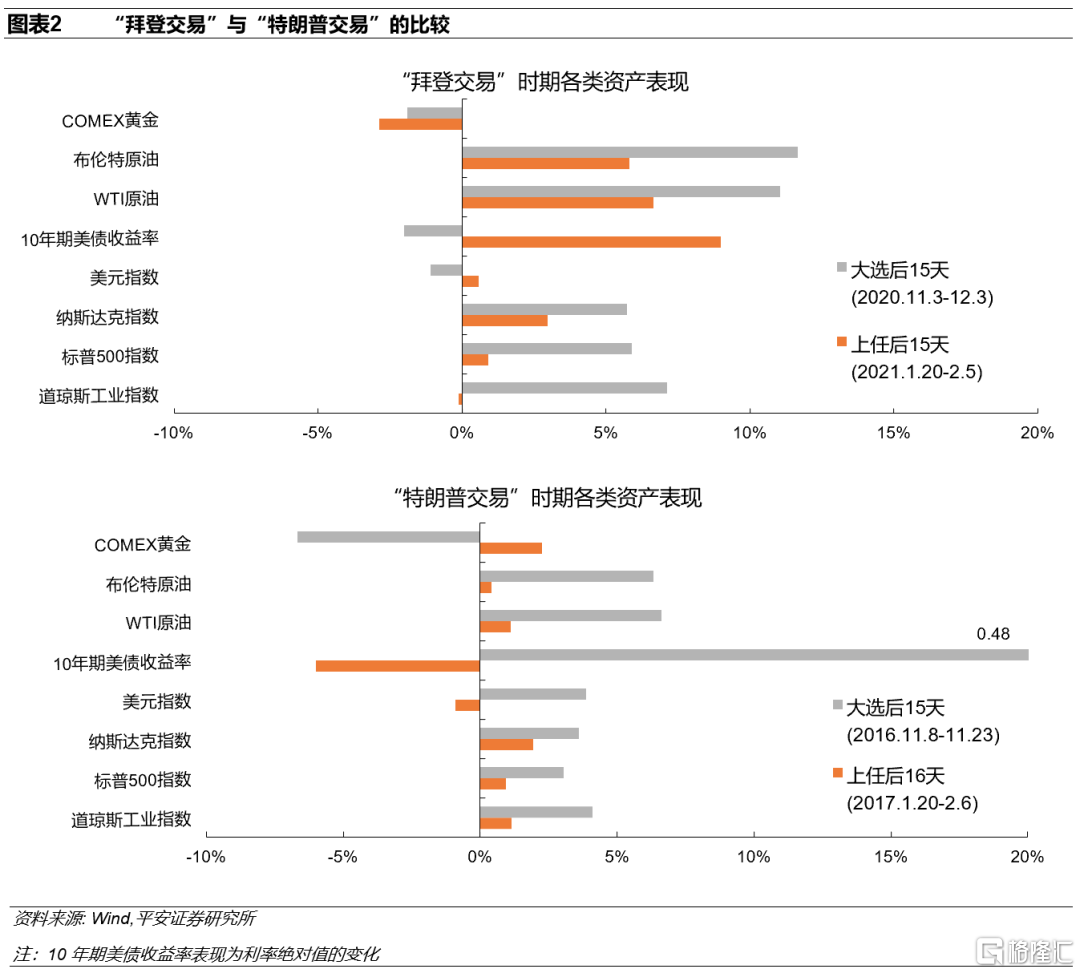 我们对比大选后(2020年11月8日)和拜登正式上任后(2021年1月20日)的15日左右的“拜登交易”行情,大选后的美股和石油价格涨幅更明显,但美元走弱和美债走牛并不符合新政交易行情,而拜登上任后虽然美股涨幅没有那么显著,但各类资产表现均符合新政交易特点。我们对比“拜登交易”与“特朗普交易”行情,大选后半个月,特朗普时期的新政交易行情更显著(美元明显走强、美债和黄金明显走弱),而正式上任后的半个月,特朗普的新政交易行情似乎已经褪去(美债和黄金走强、美元走弱)(图表2)。
