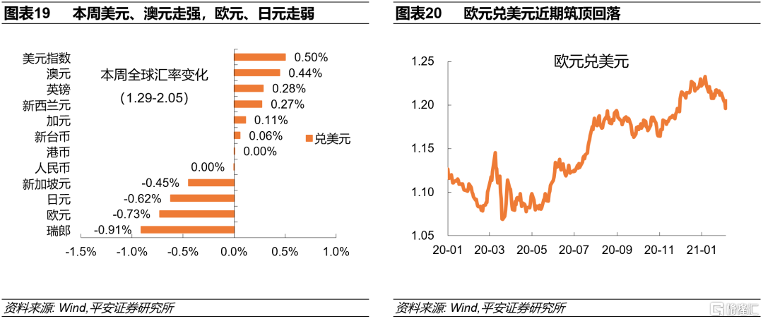 本周美元指数涨0.50%,澳元涨0.44%,而瑞郎(-0.91%)、欧元(-0.73%)和日元(-0.62%)兑美元的跌幅均高于美元指数涨幅(图表19)。澳洲和新西兰疫情得到较好控制,每周累计新增确诊病例增幅基本保持在1%以内。当前市场认为疫情对澳新两国的负面影响接近尾声,可能是两国货币走强的重要原因。