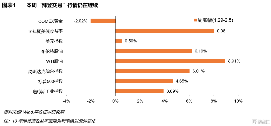 本周“拜登交易”行情仍在继续,股商汇齐牛,金债齐熊。2月1日-5日期间,美股道指、标普和纳指分别涨3.9%、4.6%和6.0%,美油和英油分别涨8.9%和6.2%,美元指数小幅上涨0.5%,10年期美债收益率涨0.08个百分点,黄金跌2.0%(图表1)。上周美联储发言后的市场消极情绪在本周有所恢复,或是美股上涨的部分原因;石油价格上行或有部分原因来自库存减少。但是,“拜登交易”行情更可能是本周各类资产表现的主逻辑,即随着拜登政府新政不断推行、美国短期疫情防控与经济复苏、以及中长期对内对外发展路径不断明朗,市场risk on情绪再度边际加强。