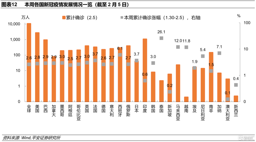 截至2021年2月5日,全球新冠累计确诊超1.06亿人,全球累计确诊增长率有所下降(2.6%,上周3.4%),防疫政策与疫苗推广的初步效果正在浮现。本周累计确诊增长最明显的国家是泰国(26.1%,上周28.0%)、马来西亚(12.0%,上周13.0%)和越南(11.8%,上周7.0%),西班牙累计确诊明显回落(6.1%,上周为8.1%)。