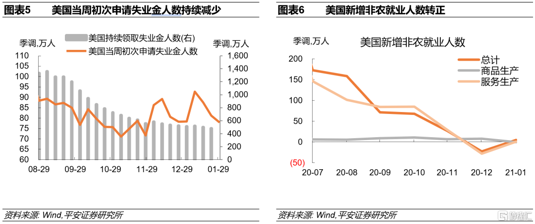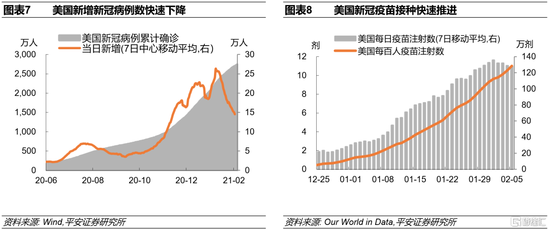 1)交易美国经济切实走向复苏的预期。本周公布的美国经济数据不乏亮点,显示美国经济复苏形势整体向好。生产较强恢复:2月2日公布的美国1月制造业PMI达到60.5,前值为57.5;2月4日公布的非制造业PMI达到57.7,前值为55.9(图表3)。就业温和反弹:2月5日公布的1月失业率由前值6.7%下降至6.3%(图表4);截至1月30日的当周初次申请失业金人数降至77.9万,前值为81.2万(图表5);2月5日公布的1月非农部门就业新增加4.9万人,预期为增加5万人,12月数据修正为减少22.7万人。其中,服务生产人员1月新增1万人,前值为减少28万人(图表6)。疫情防控成效初显:美国当日新增病例数(7日中心移动平均)继续快速下降(图表7);据牛津大学统计,美国每日疫苗接种保持130万左右,每百人疫苗接种数于2月5日已经达到11剂(图表8)。