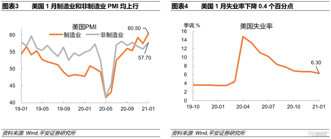 为何“拜登交易”延续至今?2020年美国大选结果的不确定性持续时间长、直至2021年1月才基本解除,使拜登交易行情更加滞后。但更重要的是,本轮“拜登交易”除了交易“确定性”,还有一系列更为具体的乐观预期值得市场进行“交易”:1)交易美国经济切实走向复苏的预期。近期公布的美国经济数据不乏亮点,生产较强恢复、就业温和反弹、疫情防控成效初显,美国经济复苏形势整体向好。2)交易拜登财政计划推行更顺利的预期。拜登政府全力推动1.9万亿刺激计划落地,包括使用每年只能使用一次的“预算调整”工具。2月5日参众两院通过了最终的预算决议,拜登计划落地预期增强。3)交易美国制造业与供应链修复的预期。近期拜登“Buy American”计划,以及发动全球供应链审查等举措,在美国中长期制造业与贸易发展上,或给予市场更多信心。4)交易中美与国际关系“正常化”的预期。近期拜登政府在中美关系上提到“耐心”、“一个中国”、“合作”等,同时表现出积极参与国际合作、团结盟友的热情,未来一个整体上趋于稳定的国际形势是可以期待的。