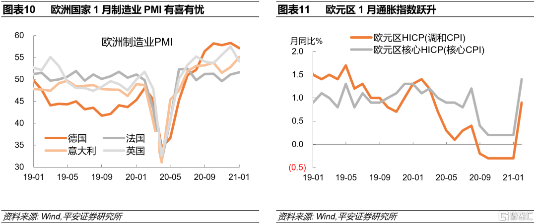 欧洲国家1月制造业PMI有喜有忧,德国英国下降、法国意大利上升。2月1日公布了欧洲国家1月制造业PMI,其中德国为57.1,前值58.3;法国为51.6,前值51.1;意大利为55.1,前值52.8,增幅较大;英国为54.1,前值57.5,仍超预期(图表10)。考虑到PMI数值较多体现环比经济活动状况,且主要国家指数均超过50的枯荣线,欧洲整体制造业活动恢复尚可。