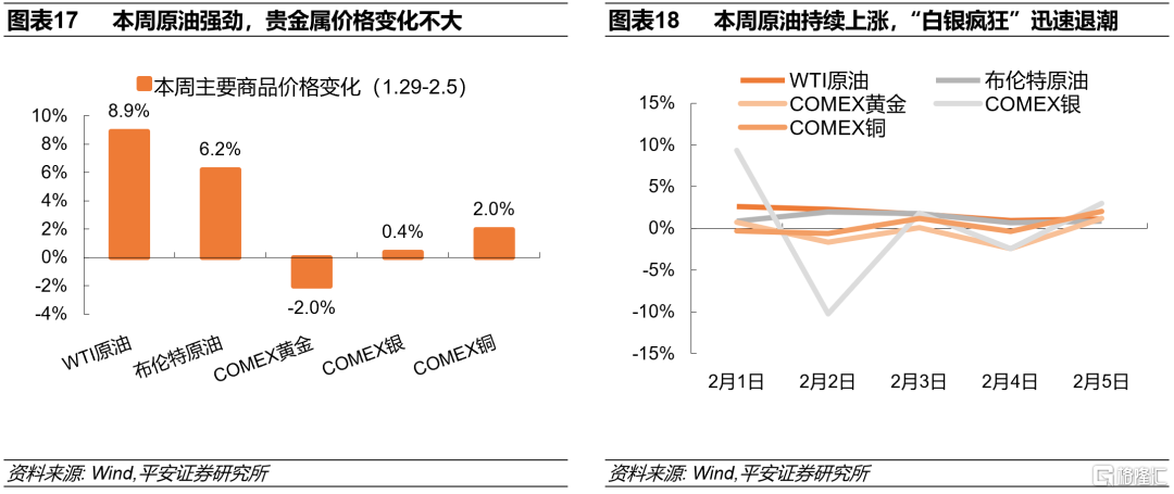 金属市场整周涨跌幅不大,金价小幅回落2.0%,铜价小幅上涨2.0%。银价于2月1日继续在“逼空大战”中激增9.3%,但2月2日骤跌10.25%,之后维持窄幅震荡,整周仅上涨0.4%,“白银疯狂”迅速退潮(图表18)。2月1日,美国商品期货交易委员会(CFTC)表示,正在密切关注白银市场最近活动,将解决白银衍生品所面临的潜在威胁。