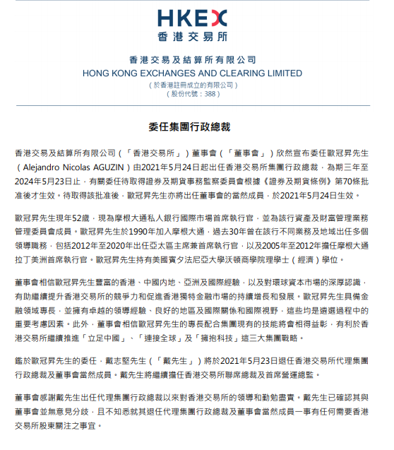 港交所公告,宣布委任欧冠昇由2021年5月24日起出任香港交易所集团行政总裁,为期三年至2024年5月23日止,有关委任待取得证券及期货事务监察委员会根据《证券及期货条例》第70条批准后才生效。待取得该批准后,欧冠昇先生亦将出任董事会的当然成员,于2021年5月24日生效。