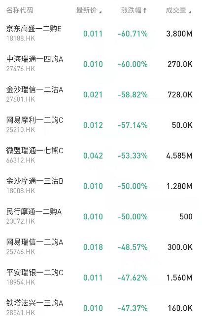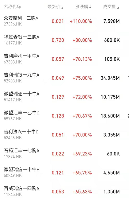 轮证涨幅榜中,快手认购证遥遥领先,众安摩利一三购A(27396)暴涨110%占据涨幅榜第一,其次是华虹麦银一三购A(16177),涨80%。