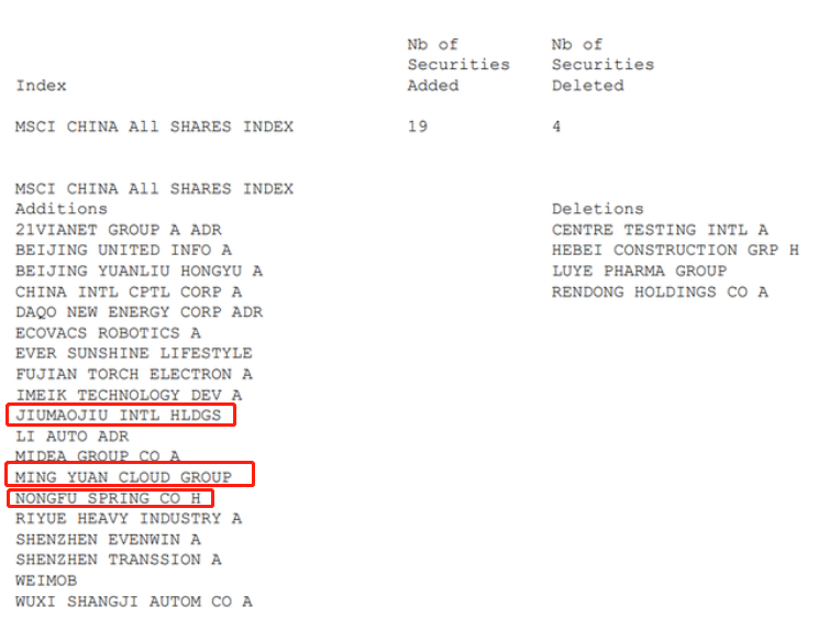 明晟公司(MSCI)公布今年二月的季度指数审阅结果,新纳入到MSCI新兴市场指数的前三大个股为美的集团、金龙鱼、农夫山泉;新纳入MSCI中国全流通指数有19只股票为:世纪互联、国联股份、鸿远电子、中金公司、大全新能源、科沃斯、永升生活服务、火炬电子、爱美客、九毛九、理想汽车、美的集团、明源云、农夫山泉、日月股份、长盈精密、传音控股、微盟、上机数控;被剔除的个股有华测检测、河北建设、绿叶制药和仁东控股。