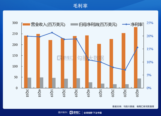 2020年公司全年营收创历史新高,达到9.613亿美元,同比增长3.1%;2020Q4营收实现2.80亿美元,同比增长15.4%,环比增长10.7%;归母净利润4360万美元,同比增长66.41%,环比增长146.3%;毛利率25.8%,同比下降1.4%,环比增长1.6%;净利率15.6%,同比增长4.8%,环比增长8.6%。