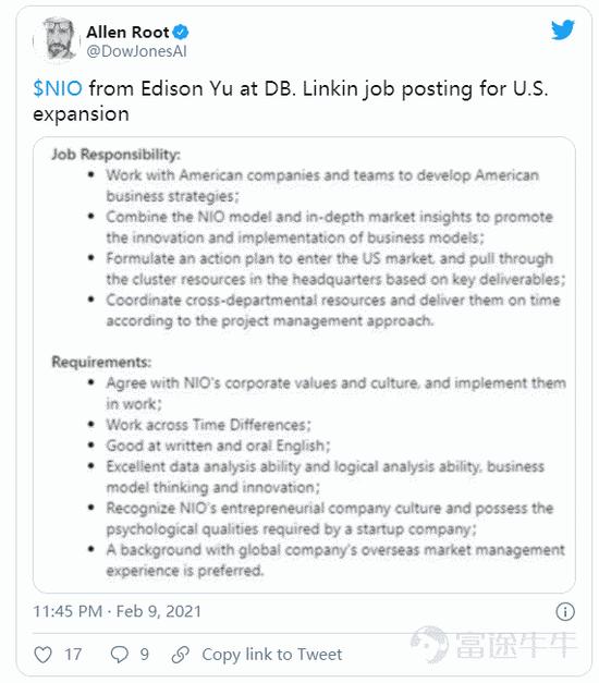 近日,德意志银行(Deutsche Bank)的分析师Edison Yu发现了一个关于蔚来或许将要进军美国市场的消息——他在领英LinkedIn上找到了一份蔚来的有关美国市场商业规划的工作。