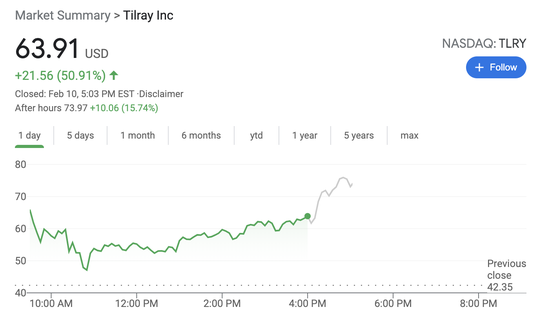 Sundial Growers收涨约78.8%,为2020年1月30日以来首次收于2.00美元关口上方,Tilray涨超50.9%,为2019年4月8日以来首次收于60美元关口上方,OrganiGram Holdings涨37.3%,Aurora Cannabis涨21.2%,NIC Inc.涨约15.7%,Cronos Group涨超14.4%,Aphria涨超10.7%、刷新收盘历史高位至26.30美元、盘中一度突破50美元整数位心理关口,Village Farms International涨约10.2%;ETF中,ETFMG Alternative Harvest ETF(MJ)收涨逾14.9%,The Cannabis ETF(THCX)也涨超13.8%。