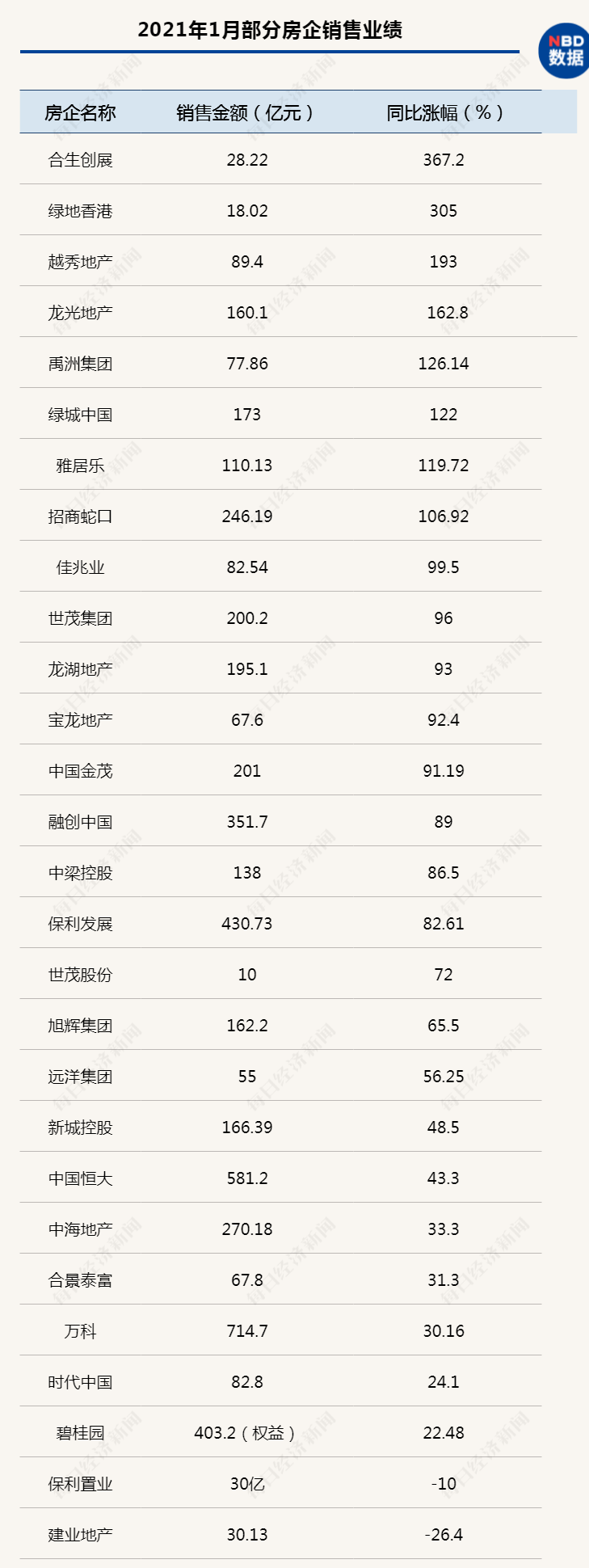 不过,克而瑞研究中心总经理林波向《每日经济新闻》记者表示,单纯看1月份房企业绩同比大幅增长,并不能代表全年业绩。1月份百强房企销售数据强势反弹,很大程度上是因为去年同期正值春节假期,且因疫情的出现而停摆这两大因素所导致的基数较低所致。此外,部分城市楼市景气度从去年下半年至今持续回暖,对行业成交有进一步刺激作用。