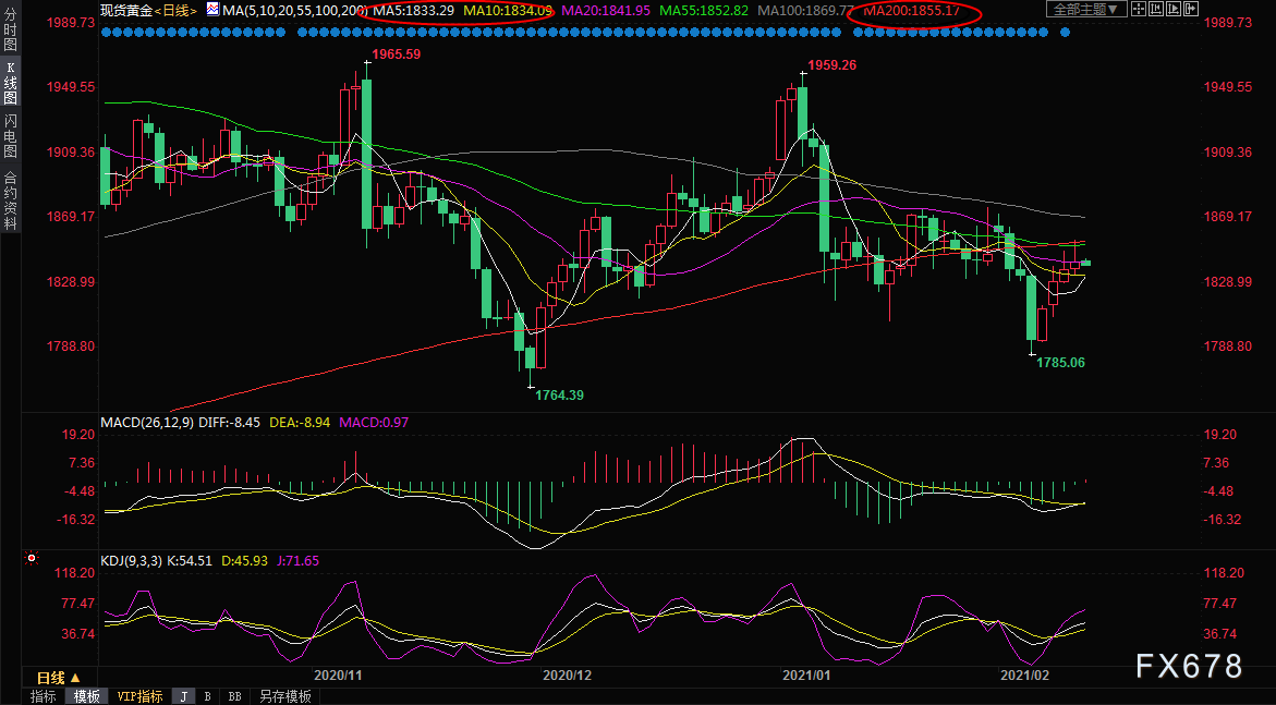 目前5日均线和10日均线支撑也都在1834附近,也是隔夜低点支撑所在,若金价失守该支撑,也会增加短线看空信号。