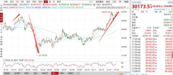 2月11日消息,港股迎来鼠年收官日,今日除夕,港股半日市,明日是农历新年,将迎来牛年。截至今日收盘,港股涨0.45%,站稳30000点大关,报30173.57点,恒生科技指数大涨近2%,再创历史新高,平安好医生暴涨20%,获女股神加持,呷哺呷哺、国美零售等涨超10%。