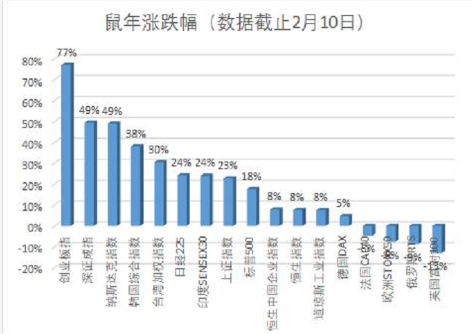 全球主要股指来看(1月25日至2月10日),创业板指暴涨77%傲视全球,深证成指涨49%,纳斯达克指数涨49%,韩国指数、台湾指数、日经指数、上证指数等涨超20%。港股恒指涨7.6%,国企指数涨7.8%,不过,恒生科技指数暴涨92%。