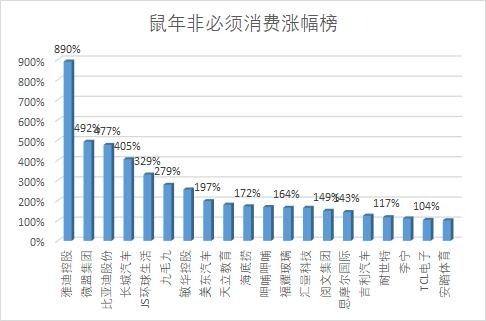 截至2月10日,非必须消费股中,电动车(新能源)雅迪暴涨了近9倍,新能源汽车股比亚迪、长城汽车没动汽车、吉利汽车涨势居前。餐饮股九毛九、海底捞、呷哺呷哺等全部翻倍,电子烟龙头思摩尔涨143%,体育龙头李宁、安踏翻倍。