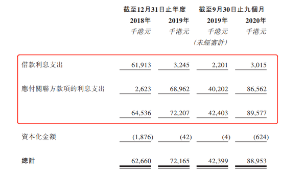 截止2020年9月底,该项支出增至8656.2万港元,占当期收入的42.3%,即期内超4成收入将用于支付关联方借款利息。