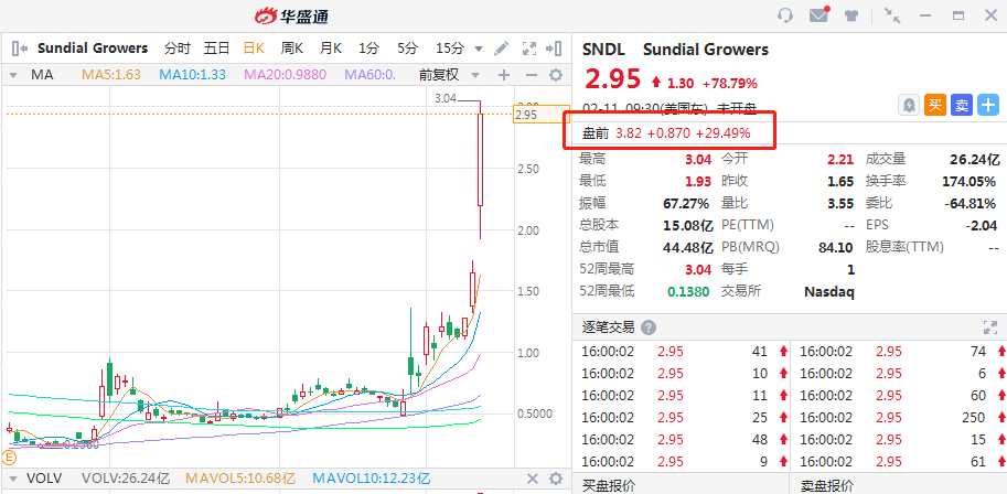 华盛资讯2月11日讯,美股盘前,工业大麻股普涨。截至发稿,Sundial Grower大涨近30%,Tilray涨超11%,Aphria涨近11%。