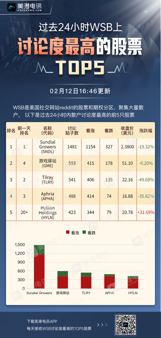 美港电讯APP 5日讯,截至下午16:46,WSB上讨论度最高的股票TOP 5分别是Sundial Grower(SNDL.O)、游戏驿站(GME.N)、Tilray(TLRY.O)、Aphria(APHA.O)和Hyliion(HYLN.O)。这五只股票在过去6小时一直处于WSB热议中心。