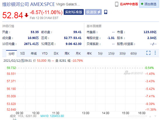 维珍银河跌11.1%,报52.84美元。此前宣布取消了原定周六的太空试飞计划。
