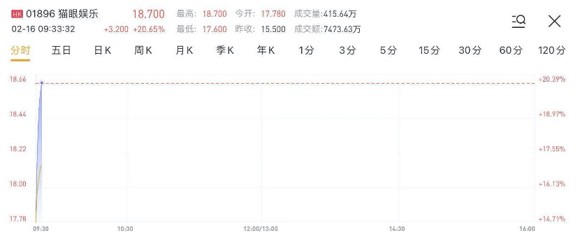 华盛资讯2月16日讯,猫眼娱乐(01896)盘中涨幅扩大至20%。截至发稿,猫眼娱乐大涨20.65%,报18.7港元,当前成交量超415万。