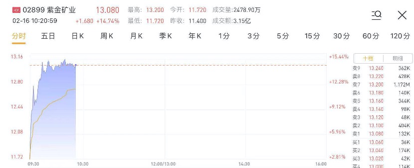 华盛资讯2月16日讯,紫金矿业大涨近15%。截至发稿,紫金矿业大涨14.74%,现报13.08港元。