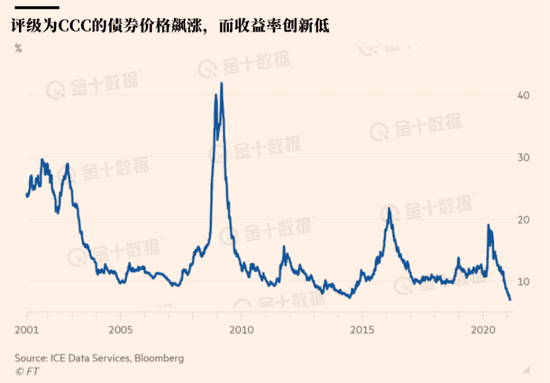 由于追逐高收益的投资者正在寻找回报更高的资产以及押注经济复苏,投资者对垃圾债的需求激增,美国企业中风险最高的借款人纷纷发行债券,使得这类借款人占自2007年以来垃圾债券交易中最大的份额。