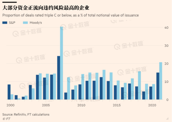 Refinitiv的数据显示,在穆迪(Moody’s)评级的垃圾债券交易中,21%的交易属于评级最低的交易;而在标普(S&P Global)的评级下,这一比例略低于15%。这两家评级机构为美国垃圾级借款人发行的绝大多数债券进行评级。