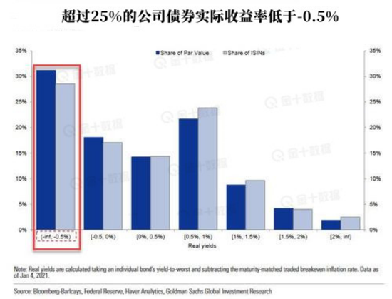 下图显示了美国债券市场上实际收益率为负的公司债券非常普遍——超过25%的公司债券实际收益率低于-0.5%。
