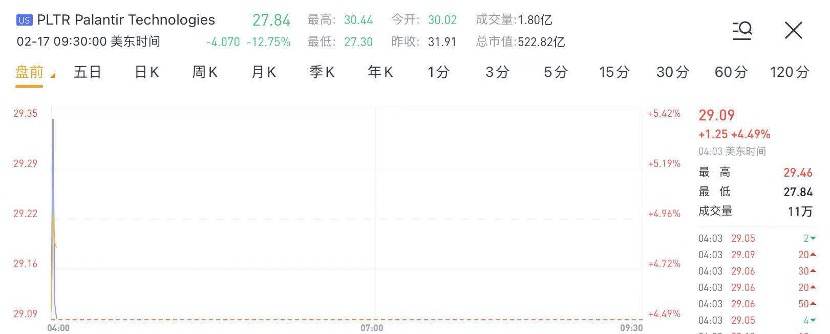 华盛资讯2月17日讯,Palantir(PLTR)盘前涨4.49%,现报29.09美元,近日获ARK基金抄底买入162万股。