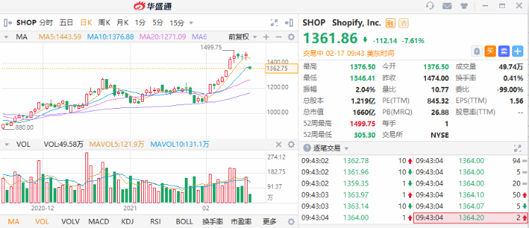 华盛资讯2月17日消息,美股早盘,Shopify跌超7%,公司预计2021年增速放缓。