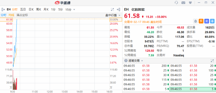 华盛资讯2月17日消息,美股早盘,亿航智能(EH)盘中停牌,此前涨幅扩大至33%。公司回应沽空报告称鹍翔在公司IPO之前和之后都不是亿航的股东,所有与鹍翔的合同都是基于正常交易。