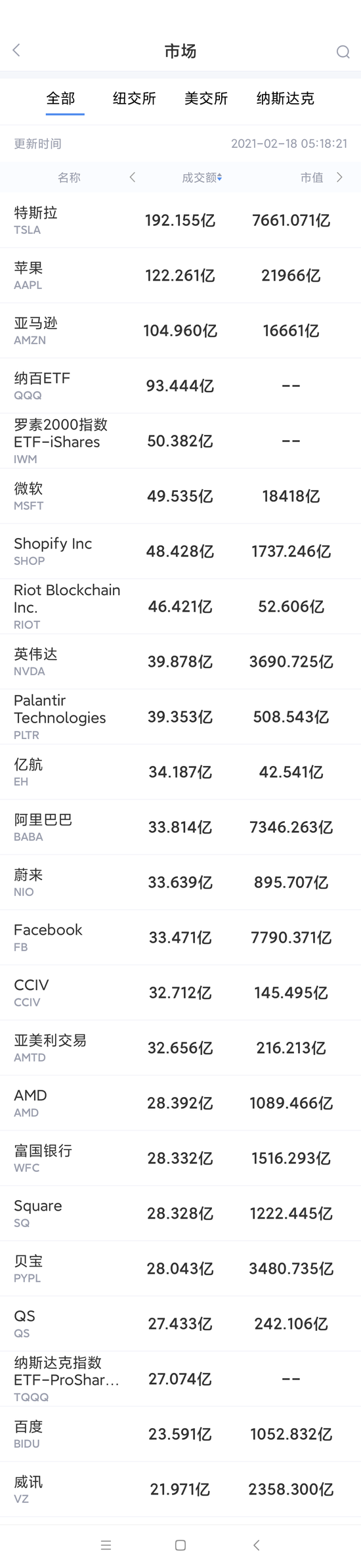 以下为美股当日交易最活跃的20只股票(按成交额):
