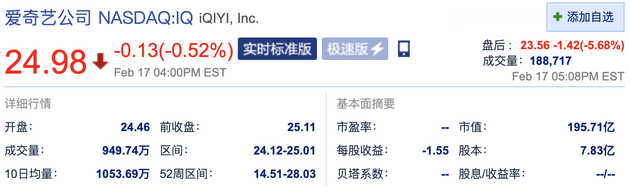 新浪科技讯 2月18日凌晨消息,爱奇艺周三收盘微跌0.52%报24.98美元,市值195.71亿美元。截至北京时间06:08,爱奇艺盘后股价跌5.68%报23.56。