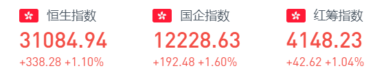 周三,恒生指数开盘跌0.36%,全天低开高走,午后站上三万一关口,为2018年6月以来首次。截至收盘,恒生指数涨338.28点或1.1%,报31084.94点,全日成交额达2079.89亿。国企指数涨1.6%,报12228.63点,红筹指数涨1.04%,报4148.23点。
