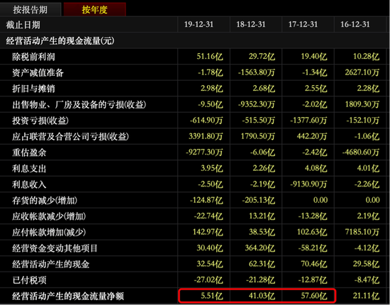 而且在经营性现金流净额这一项指标上,建业表现同样不稳。 2017年和2018年,建业凭借棚改红利分别实现57.6亿元和41.03亿元的经营性现金流净额。 但到2019年,受制于棚改红利消失,全年经营性现金流金额巨幅下跌至5.51亿元,同比减少87%。